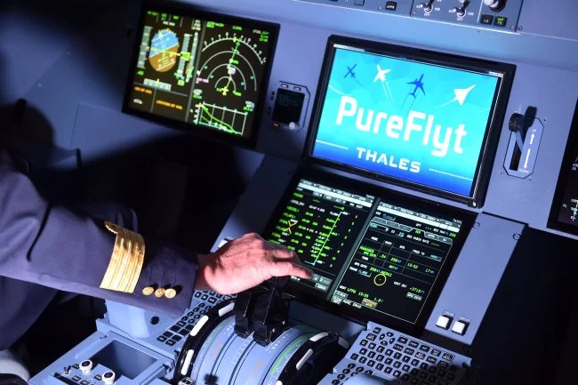PureFlyt est un nouveau système de gestion de vol communément désigné par le sigle anglais FMS [1], pensé « comme le cerveau de l’aviation de demain ». Cette solution permettra de calculer en temps réel de nouvelles trajectoires de vol optimisées, via un échange permanent de données entre l’appareil, les composantes sols, la compagnie aérienne et le contrôle aérien transmises par les constellations satellitaires.