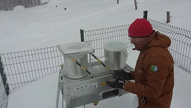 Sur les photos : Grâce à la plateforme pyrénéenne des observations atmosphériques du Pic du midi, des microplastiques ont été détectés dans l’air, à cette altitude. // Échantillonneur de dépôts atmosphériques opéré par Gaël Le Roux - Crédits : Jeroen Sonke.