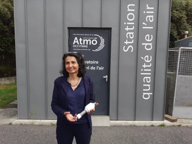 Sur la photo : Dominique Tilak, la directrice générale d’Atmo Occitanie, présente une "cartouche" (dispositif de captage des perturbateurs endocriniens dans l’air) devant la station de mesures toulousaine. Crédit : Zoltan Bach - ToulÉco.