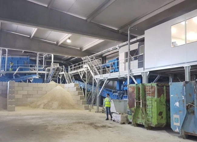 Sur la photo : Chaine de tri permettant d’écraser et trier les rébus de plaques de plâtre pour extraire le gypse. Photo Recygypse.