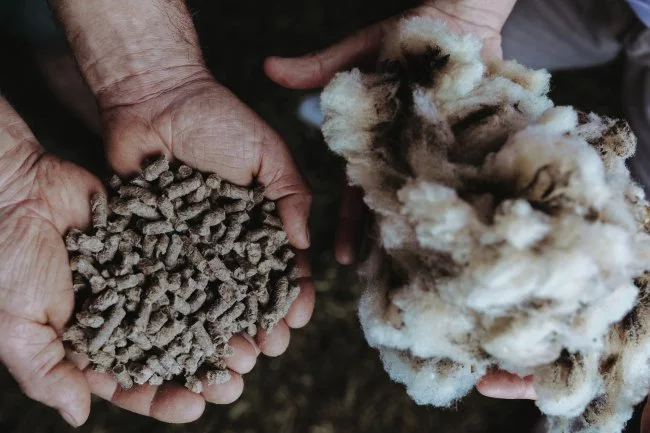Sur les photos : La laine est transformée en granulés d’engrais conditionnés ensuite en sacs pour les particuliers. Crédit : Fertilaine.