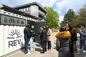 Que vient faire un ancien conteneur maritime surmonté de six panneaux photovoltaïques sur le parking de l’Agence régionale énergie climat d’Occitanie (Arec) ? Cet espace de 15 mètres carrés (la taille d’une place de stationnement classique), à proximité de La Cité, dans le quartier Montaudran, est en réalité la première station Rev, dédiée au stationnement des vélos et à la recharge des vélos électriques par le biais des fameux panneaux.