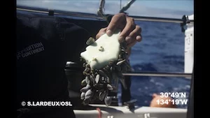 Sur la photo : Claire Pusineri et Patrick Deixonne, de l’expédition 7ème continent, récupèrent un filet à plancton. Photo 2 / Des crustacés attachés à un macro-déchet. Copyright S.Lardeux/OSL. Photo 3/ Pierre Bahurel, directeur de Mercator Océan. Copyright Rémi Gabalda. Photo 4/ La soupe de plastique.