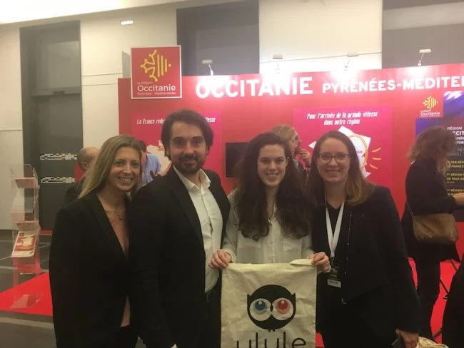 Sur la photo 1 : dessin perspective du bouquet de Canopée qui sera installé Place Roghuet en septembre 2018. Photo 2 : l’équipe de la JCE qui porte le projet à Toulouse, lors de la remise du prix Ulule à Futurapolis 2017. Photo DR